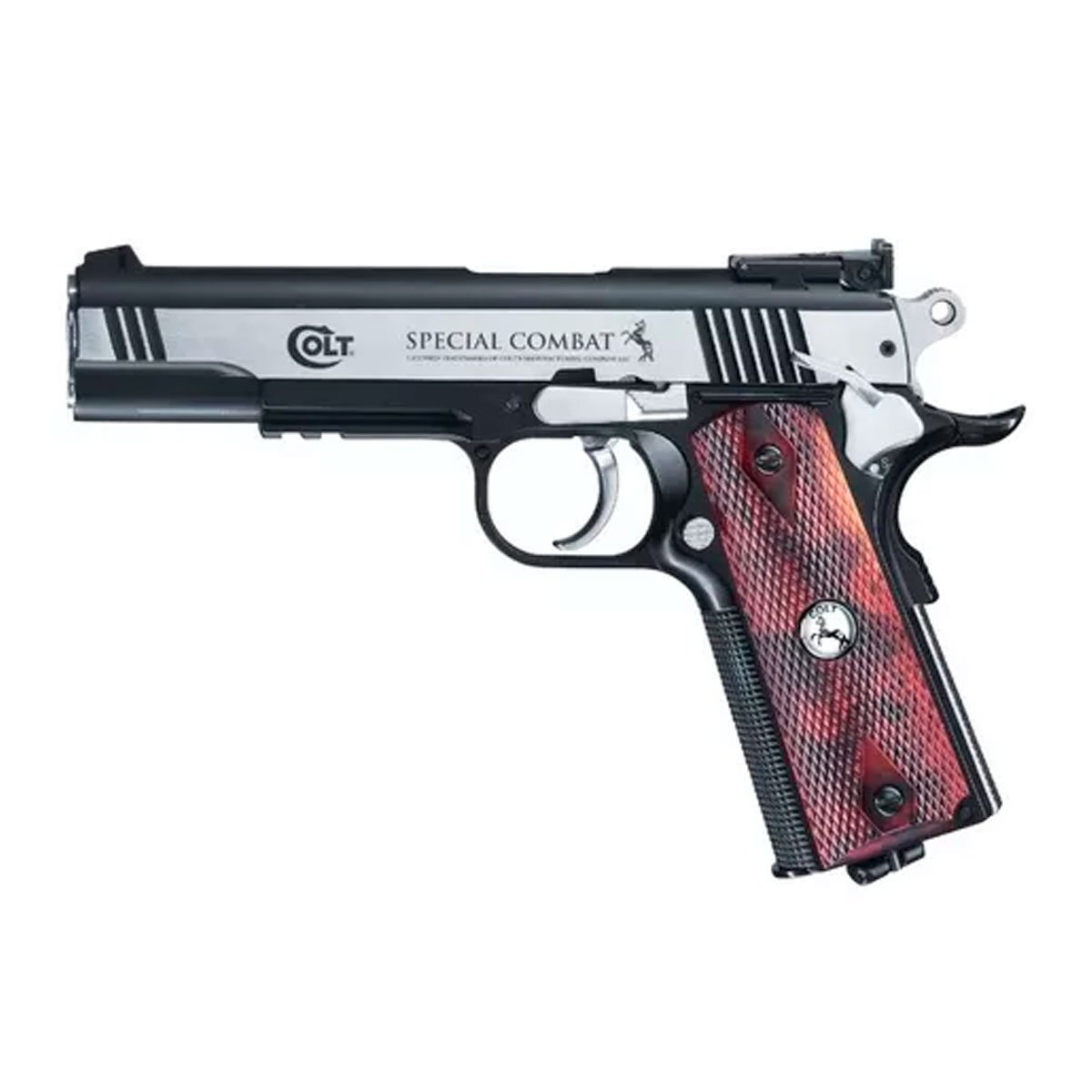 CARACTERISTICAS DEL PRODUCTO: La pistola semiautomática Colt Special Combat es parte de la empresa alemana de Umarex, Se hizo todo en metal a excepción de los agarres, peso y diseño extremadamente realistas hacen que sea muy similar al modelo real. Caño estriado, cargador de chumbos esféricos. » Marca: Umarex. » Modelo: 5.8096 » Calibre: 4.5 mm (.177). » Municion: BB acero. » Fuente de energia: Capsula de CO2 (12grs.). » Capacidad del cargador: 19 Balines BB. » Dispositivo visor: Mira fija y mira trasera ajustable. » Max. Energia 3,5 Joule aprox. » Accion: Single y doble action. » Seguro: Manual. » Cañon: Liso. » Longuitud 218 mm. » Longuitud del cañon 122 mm. » Peso: 928 g. » Velocidad: 125 m/s. » Distancia maxima de peligro: 500m. » Sin Blowback (Con movimiento manual de corredera) | ✅ SKU: 190-0088 ✅ Stock: En stock |